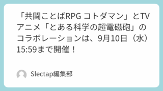 おすすめ 「共闘ことばRPG コトダマン」とTVアニメ「とある科学の超電磁砲」のコラボレーションは、9月10日(水)15:59まで開催! 共闘ことばRPG「コトダマン」と人気アニメ「とある科学の超電磁砲」の初のコラボレーションが、2025年8月22日より開催... 2025.09.05 おすすめ